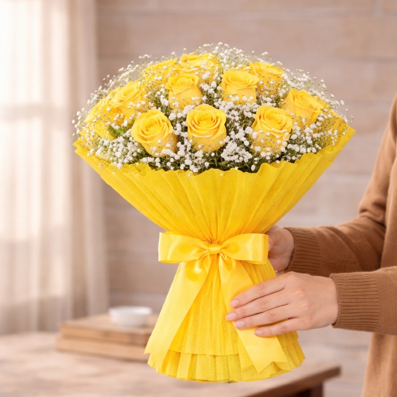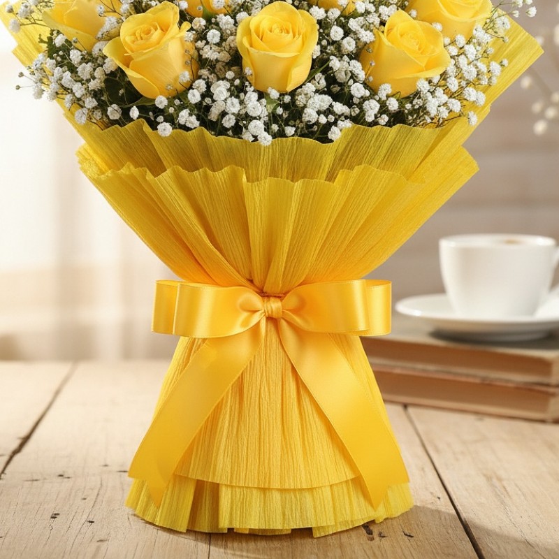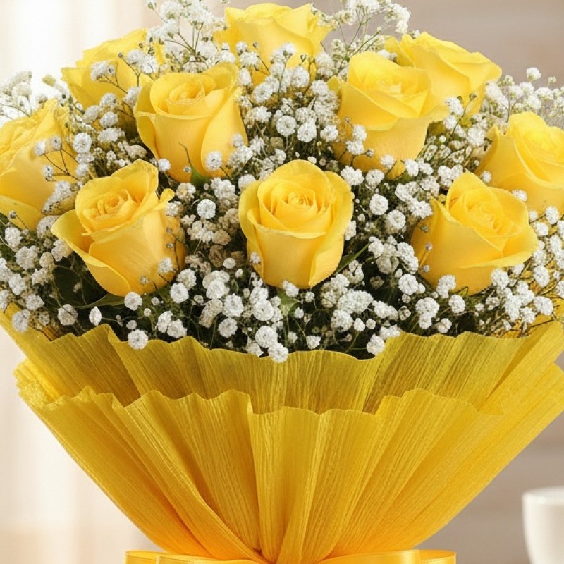 Bright and cheerful, this Bunch of 10 Yellow Roses in Yellow Paper Packing is a perfect symbol of friendship and joy. Carefully handpicked and artistically wrapped in vibrant yellow paper, this bouquet is ideal for spreading positivity, celebrating special moments, or simply bringing a sunny smile to someone’s day.