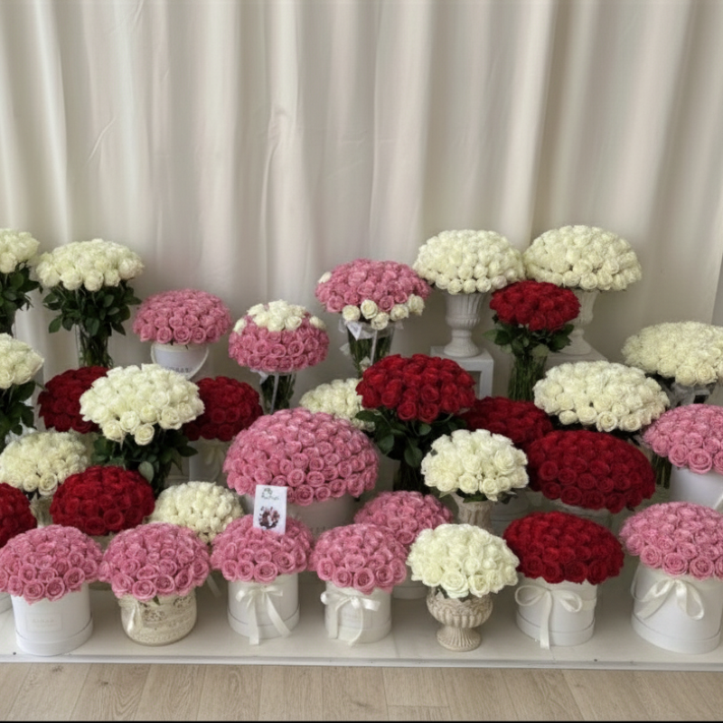 Indulge in pure floral luxury with our Royal Grandeur Collection, featuring an awe-inspiring 2,500 fresh-cut roses in shades of red, pink, and white. Each bloom is carefully handpicked and artistically arranged in premium vases and designer boxes creating a stunning display of elegance and love. Perfect for grand celebrations, weddings, or luxury gifting.