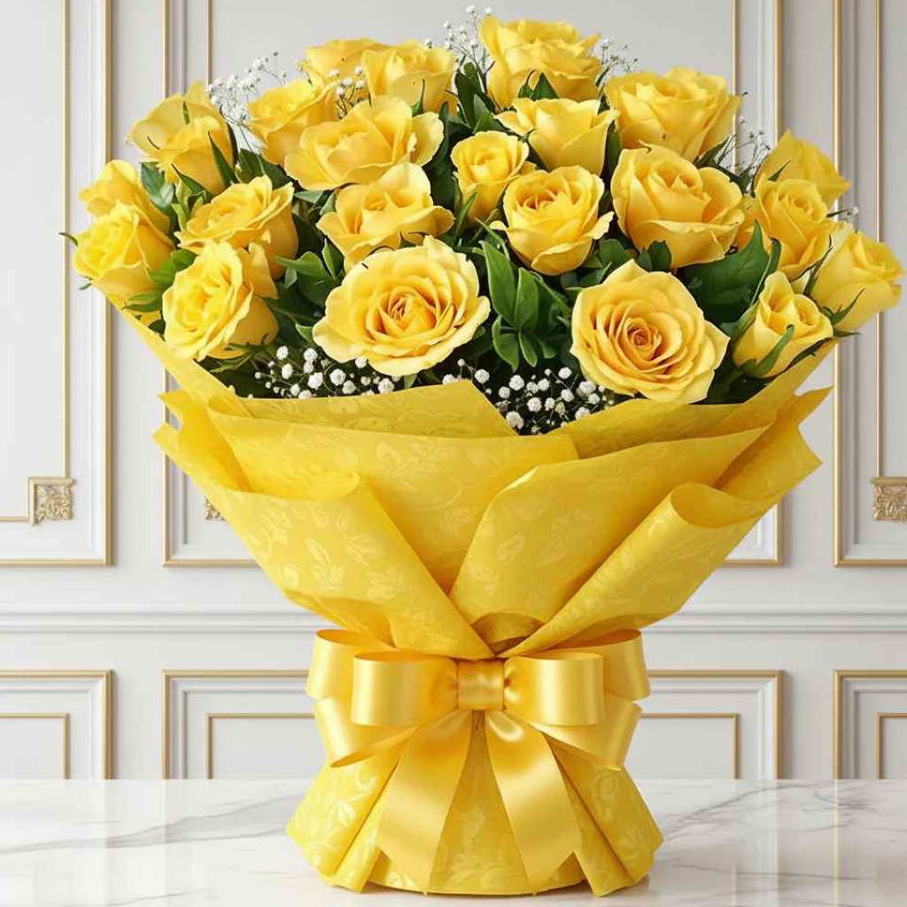 Celebrate warmth and happiness with this Bunch of 25 Yellow Roses in Yellow Paper Packing. Handpicked for freshness, these vibrant roses symbolize friendship and joy. Wrapped beautifully in bright yellow paper, this cheerful bouquet makes a perfect gift for birthdays, congratulations, or simply to brighten someone's day with sunshine and smiles.