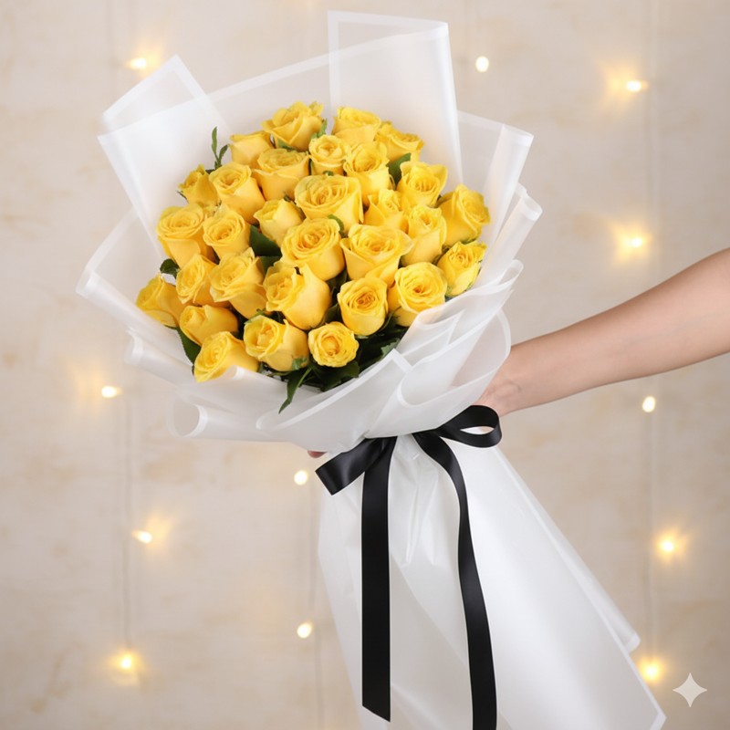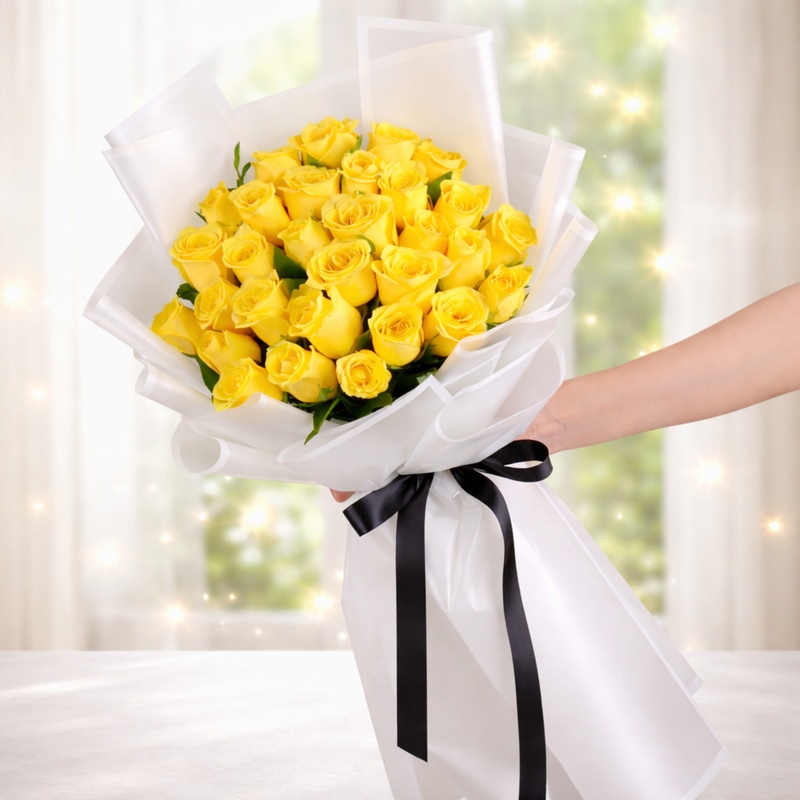 A vibrant bouquet of 35 fresh yellow roses, artistically wrapped in premium white paper and finished with a classic ribbon. These sunny blooms represent happiness, friendship, and positive energy, making them perfect for birthdays, congratulations, thank-you gifts, or brightening someone’s special day with cheer and warmth.