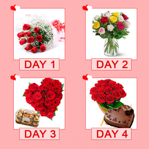 4 days amazing surprise gift package for your loved ones. That contains Day 1 - 10 Red Roses, Day 2 - a bunch of mix Roses, Day 3 - Heart shape Arrangement of 30 Red Roses & 16 Ferro Rocher, Day 4 - 20 Red RoseS & 1/2Kg Heart-shaped Chocolate Cake. Note: Select the starting date of delivering the serenade while placing your order. For example - select 11th February for delivering serenade from 11th to 14th Feb.