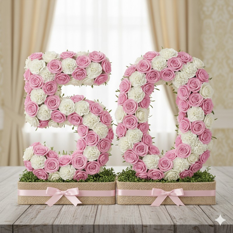 Celebrate a milestone 50th birthday or golden anniversary with this elegant floral arrangement shaped as the number 50, handcrafted using premium pink roses, white carnations, and fresh greenery. Each number sits on a ribbon-wrapped base for a luxurious finish.