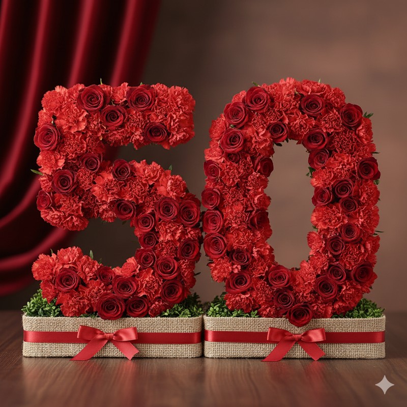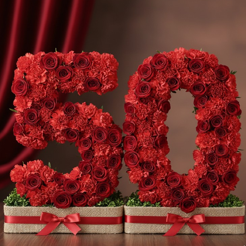 Mark a milestone moment in grand style with our Red Luxury Floral Number “50” Arrangement. Expert florists handcraft each digit using fresh velvety red roses and lush red carnations, creating a rich, elegant, and impactful design. The floral numbers are mounted securely on a jute-wrapped base, accented with a deep red satin bow for a premium finish.