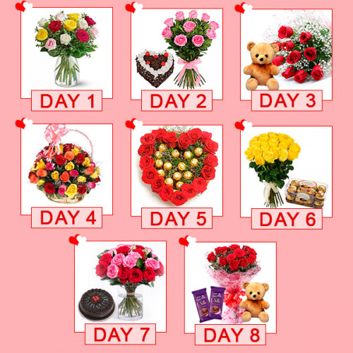 The best valentine serenade that contains 8 days surprises. Day 1 - 20 Mix Roses, Day 2 -10 pink roses & a Heart Shape Blackforest Cake, Day 3 - 10 Red Roses & 6-inch teddy bear, Day 4 - a basket of 20 Mix Roses, Day 5 - Heart-shaped arrangement of 20 Red Roses & 16 Ferro Rocher, Day 6 - 12 Pink Roses & 16 Ferro Rocher, Day 7 - 10 Mix Roses & 1/2 Kg Chocolate Truffle Cake, Day 8 - 10 Red Roses, 2 diary milk Silk & 6-inch teddy. Note: Select the starting date of delivering the serenade while placing your order. For example - select 7th February for delivering serenade from 7th to 14th Feb.