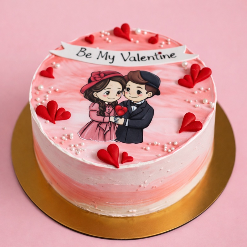 Celebrate love with this adorable Be My Valentine photo cake. Designed with a romantic couple illustration, delicate heart details, and soft pink ombré frosting, this cake is perfect for Valentine’s Day, anniversaries, or surprises. Freshly baked with rich, creamy layers and premium edible printing.