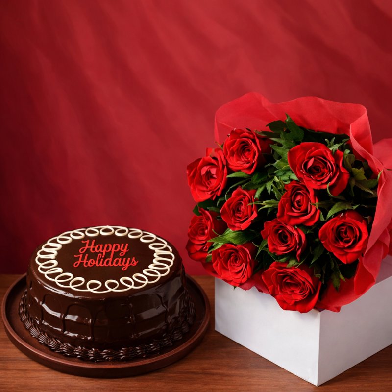 Celebrate the festive season with timeless elegance through this holiday combo featuring a rich chocolate cake decorated with a warm holiday message, paired with a luxurious bouquet of fresh red roses arranged beautifully in a premium box. A perfect gift to express love, celebration, and festive cheer.