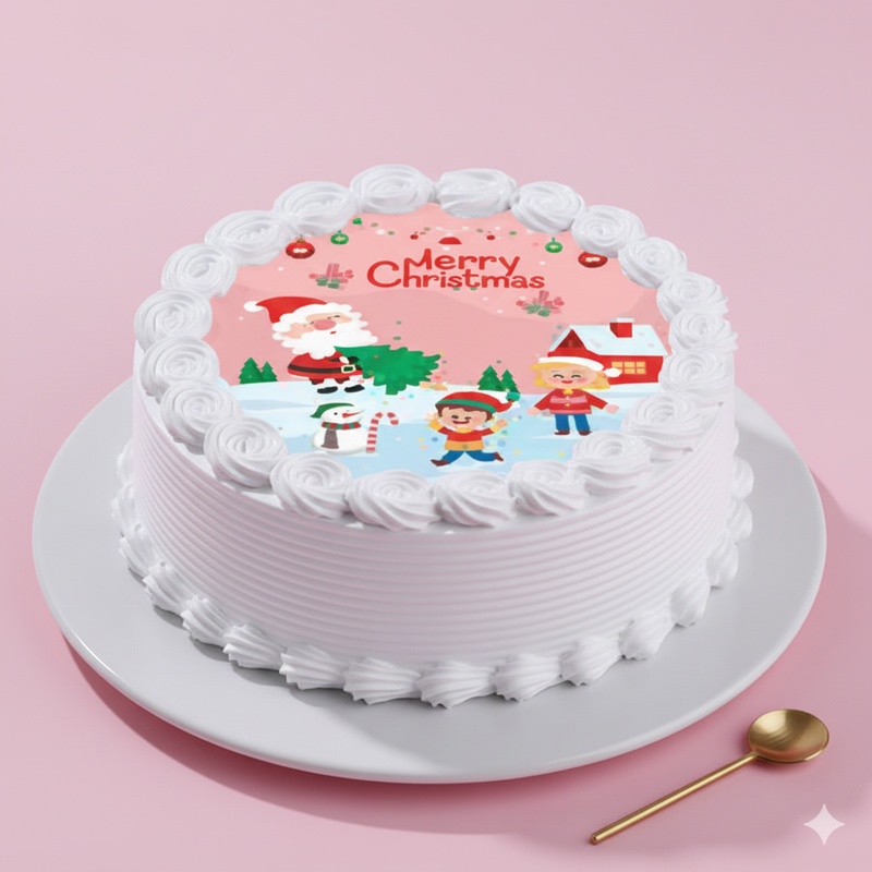 Celebrate the festive season with this delightful Christmas-themed photo cake, decorated with a cheerful Santa and holiday illustrations. Finished with smooth white cream and soft sponge layers, this ½ kg cake is perfect for small Christmas gatherings and joyful celebrations.