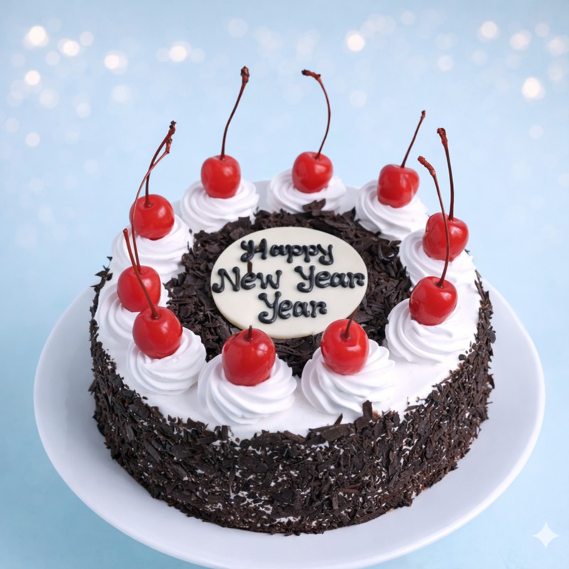 Celebrate the New Year with timeless indulgence. This classic Black Forest cake is layered with rich chocolate sponge, fresh whipped cream, and topped with juicy glazed cherries and chocolate shavings. Finished with a festive “Happy New Year” message, it’s the perfect centerpiece for intimate celebrations and joyful gatherings.