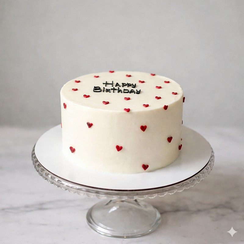 A timeless celebration cake with smooth vanilla frosting, delicately decorated with tiny red heart sprinkles and a charming “Happy Birthday” message on top. Perfect for birthdays of all ages, this elegant cake offers a soft texture, balanced sweetness, and a simple yet heartfelt presentation for joyful moments