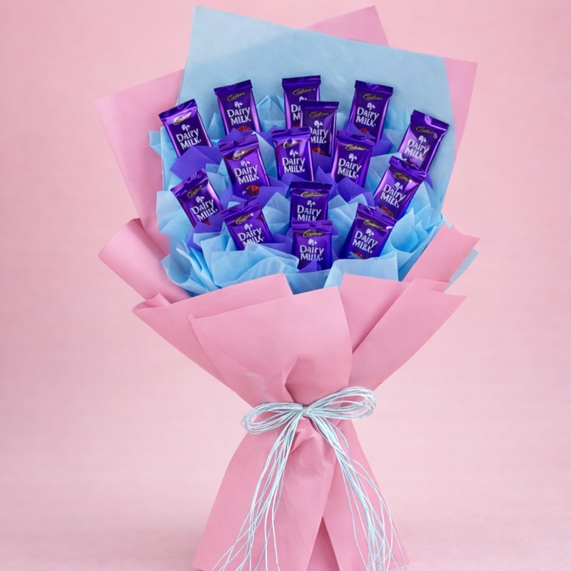 This elegant chocolate bouquet is crafted with premium Cadbury Dairy Milk bars arranged beautifully in soft blue and pink wrapping, finished with a stylish silver ribbon. A perfect gift for Valentine’s Day, birthdays, anniversaries, or to surprise someone special with sweetness, love, and delightful chocolatey happiness.