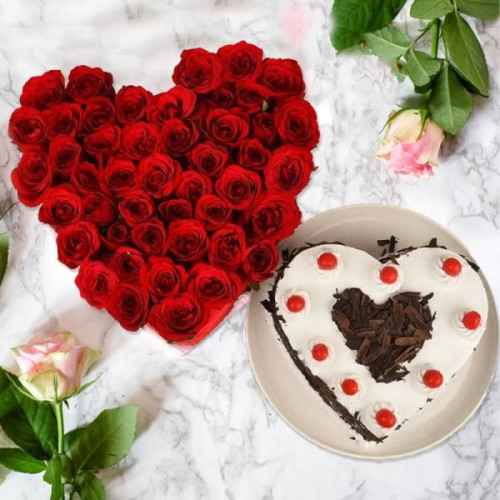 Celebrate love in its purest form with a heart-shaped arrangement of 40 velvety red roses each petal whispering passion. Paired with a delectable heart-shaped Black Forest cake, this duo is a symphony of romance and indulgence. Perfect for anniversaries, proposals, or unforgettable surprises that leave a lasting impression on the heart
