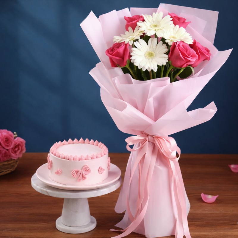 Celebrate special moments with this charming combo featuring a beautifully crafted pink cake adorned with delicate details, paired with a fresh bouquet of pink roses and white gerbera flowers wrapped in elegant pastel packaging. A graceful gift ideal for birthdays, celebrations, and heartfelt surprises.