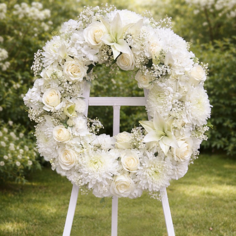 A graceful white floral wreath designed with fresh roses, lilies, chrysanthemums, and delicate baby’s breath flowers. Symbolizing peace, love, remembrance, and respect, this arrangement is perfect for funerals, memorial services, and condolence offerings. Its elegant circular design creates a heartfelt tribute to honor cherished memories