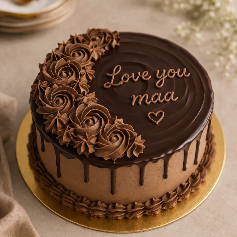 This rich and elegant chocolate cake is beautifully designed with smooth chocolate frosting, glossy ganache drips, and delicate floral piping. Featuring a heartfelt “Love You Maa” message, it is the perfect cake to celebrate Mother’s Day and make your mother feel truly special. Its luxurious look and irresistible chocolate appeal make it a memorable gift for the occasion