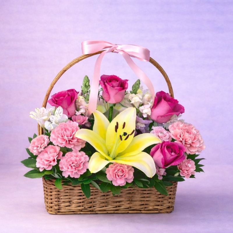 This beautiful basket arrangement features a graceful mix of roses, carnations, a blooming lily, and fresh greenery. The wicker basket and soft ribbon detailing create a premium and elegant gift presentation.