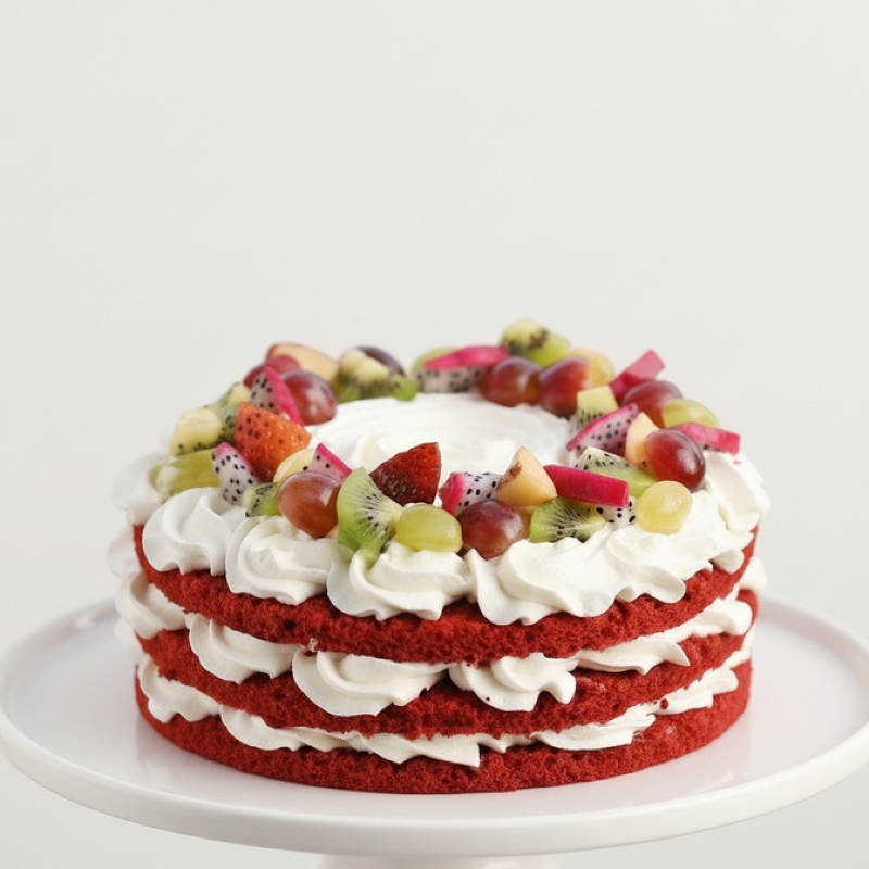A delightful red velvet cake layered with soft cream and topped with a fresh assortment of seasonal fruits including kiwi, grapes, strawberries, and dragon fruit. Light, refreshing, and beautifully balanced, this cake is perfect for birthdays, celebrations, and those who love a fresh, fruity twist on a classic favourite.
