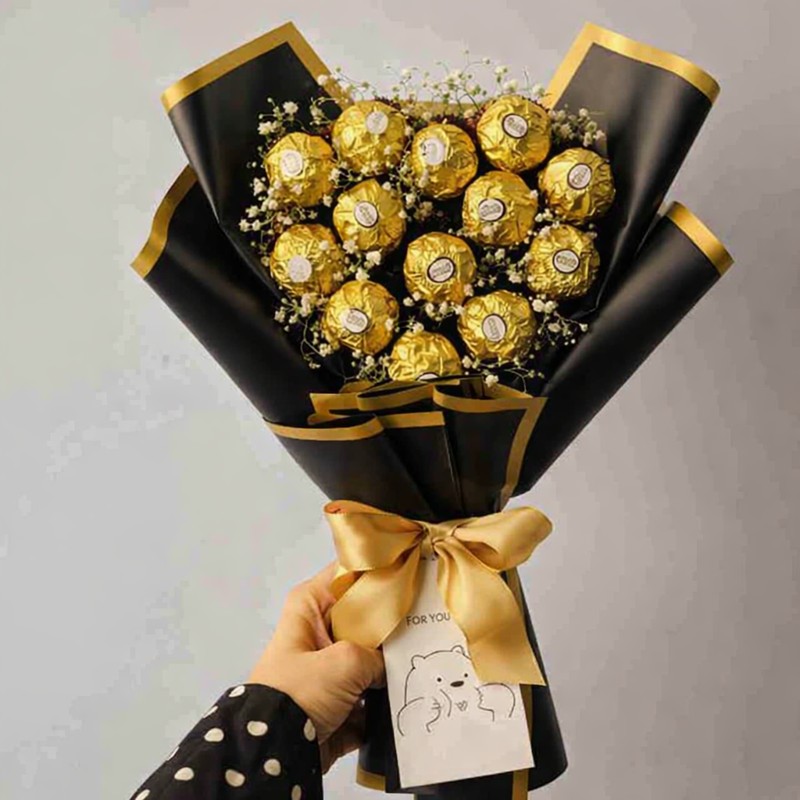 A premium chocolate bouquet featuring delicious Black-wrapped chocolates, beautifully arranged with delicate fillers and wrapped in elegant black and gold paper. Perfect for gifting on birthdays, anniversaries, celebrations, and special moments.