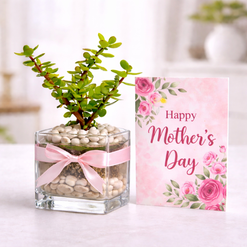This fresh jade plant arrangement is beautifully presented in a glass pot with white pebbles and a pink ribbon. The included Mother’s Day card adds a sweet and thoughtful touch to the gift.