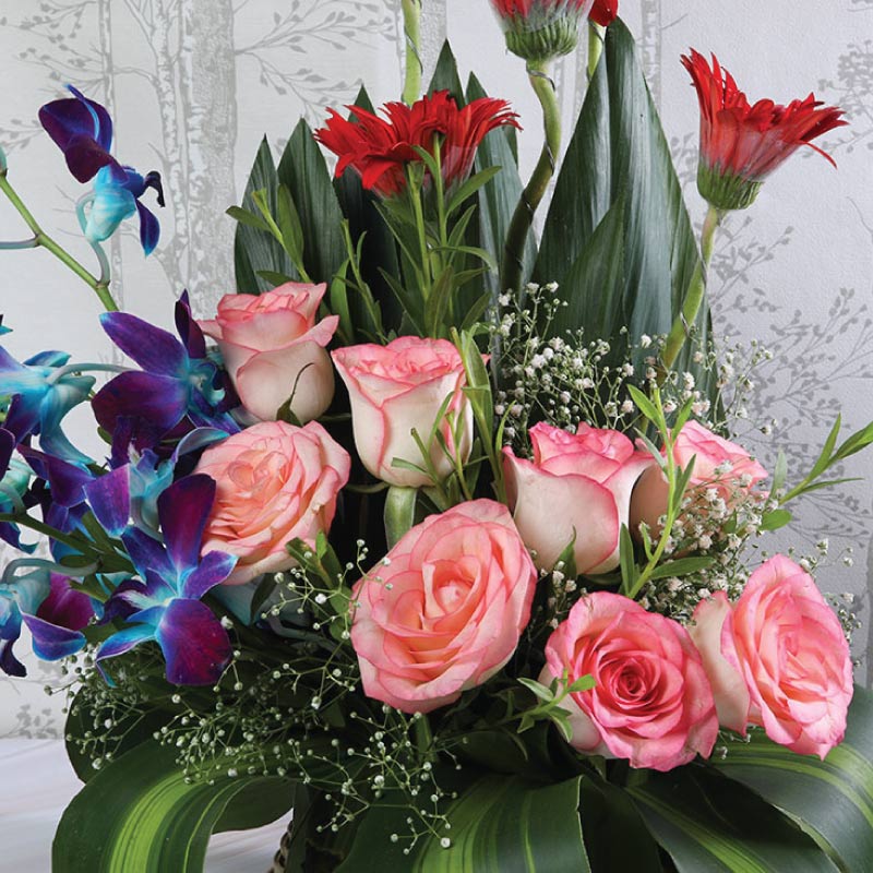 Discover a symphony of colors and fragrances with our exquisite basket arrangement. Featuring 8 charming pink roses, 6 vibrant red gerberas, and 3 stunning blue orchids, carefully arranged in a rustic basket, this ensemble radiates beauty and sophistication, making it an ideal gift for any occasion that deserves celebration.