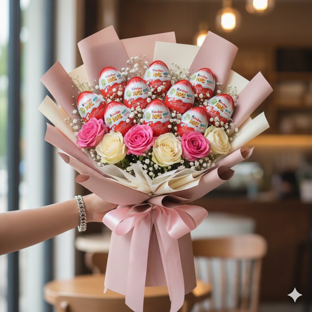 Surprise your loved ones with this adorable Kinder Joy & Roses Bouquet, beautifully arranged with pastel pink and cream roses, baby’s breath, and 10 Kinder Joy chocolates. Wrapped in soft premium paper with a satin bow, this unique bouquet is perfect for birthdays, anniversaries, and sweet celebrations.