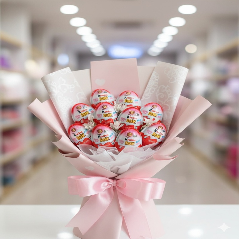 Delight your loved ones with this adorable Kinder Joy Bouquet, beautifully wrapped in soft pink paper and finished with a satin ribbon. Filled with everyone’s favorite Kinder Joy chocolates, this bouquet is perfect for birthdays, kids’ celebrations, surprises, and return gifts. A fun and creative way to spread joy and sweetness