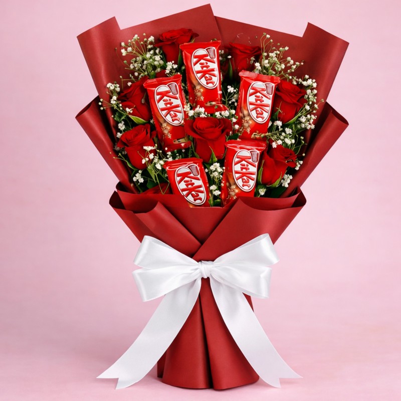 Surprise your loved one with this beautiful KitKat Love Bouquet, a perfect blend of fresh red roses and delicious KitKat chocolates. Wrapped in premium red paper and finished with an elegant white ribbon, this bouquet is ideal for expressing love on Valentine’s Day, anniversaries, and special moments.