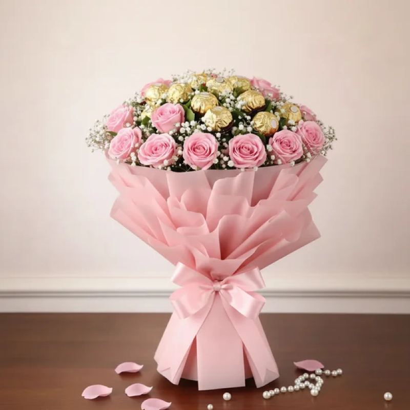 A graceful bouquet of soft pink roses, golden chocolate blooms, and delicate baby’s breath, wrapped in elegant pastel pink paper. Designed to celebrate love, warmth, and appreciation, this luxurious arrangement is the perfect Mother’s Day gift to make every mother feel truly cherished and special.