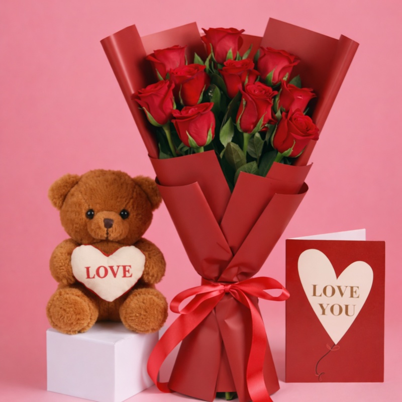 Celebrate love in its purest form with this beautiful Valentine’s Day gift combo. Featuring a hand-wrapped bouquet of fresh red roses, a soft and cuddly teddy bear holding a love heart, and a heartfelt greeting card, this arrangement is perfect for expressing your deepest emotions. Ideal for Valentine’s Day, anniversaries, or romantic surprises, this combo speaks the language of love without saying a word.