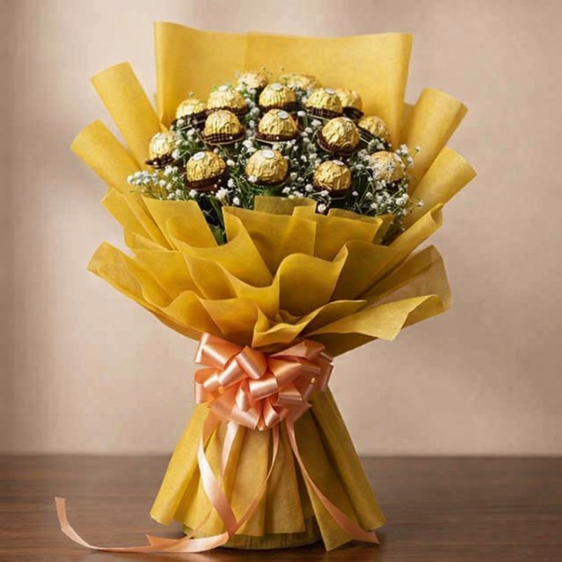 A luxurious chocolate bouquet featuring premium golden-wrapped chocolates arranged with delicate white fillers and wrapped in elegant yellow paper. Finished with a soft ribbon bow, this bouquet is perfect for birthdays, anniversaries, congratulations, festive celebrations, and thoughtful gifting that leaves a lasting impression.