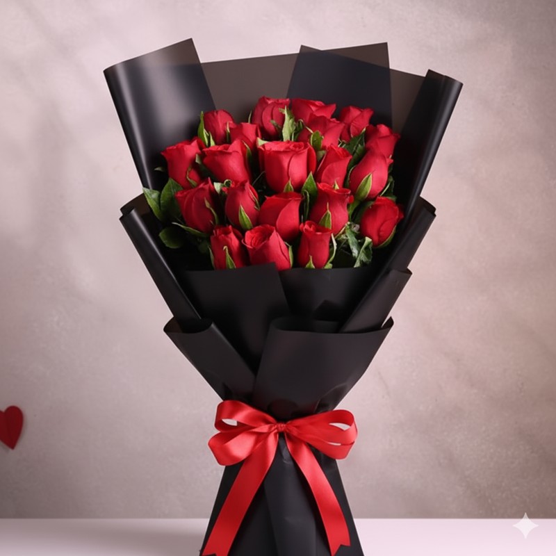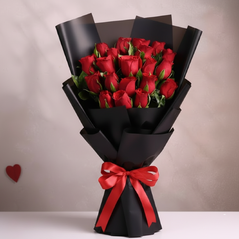 A luxurious bouquet of 25 fresh red roses beautifully wrapped in premium black paper and finished with a striking red ribbon. This elegant arrangement symbolizes deep love, passion, and admiration, making it the perfect gift for anniversaries, romantic occasions, birthdays, and special celebrations
