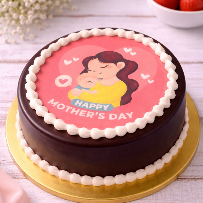 This delightful Mother’s Day cake is crafted with smooth chocolate frosting and decorated with a charming image of a mother and child surrounded by hearts. Its elegant design and emotional appeal make it a perfect choice for celebrating the endless love and care of your mother.