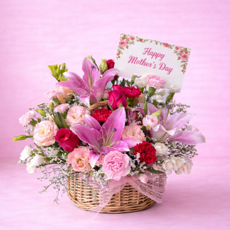 This beautiful flower basket is arranged with fresh pink lilies, roses, carnations, lisianthus, and delicate filler flowers in soft pastel shades. Presented in an elegant wicker basket with lace ribbon detailing and a sweet Mother’s Day card, it creates a graceful and heartwarming gift for your mother.