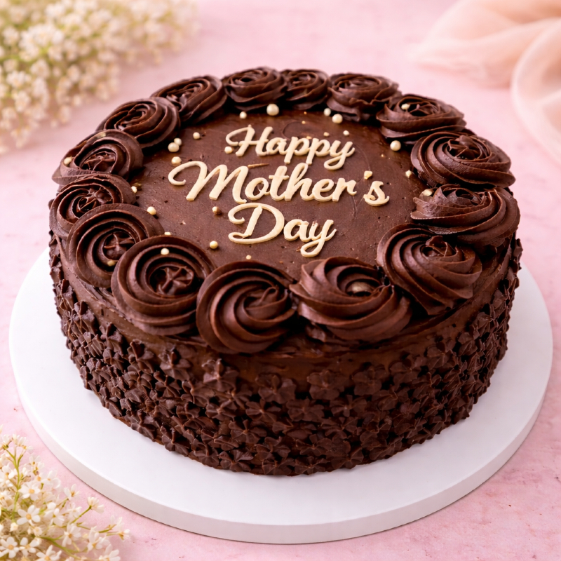 This elegant chocolate cake is beautifully decorated with rich chocolate rosettes, delicate golden pearls, and a stylish Happy Mother’s Day message in the center. Its luxurious chocolate finish and premium design make it a perfect cake for celebrating Mother’s Day in the sweetest way.