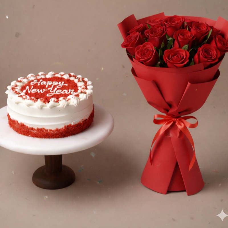 Welcome the New Year with timeless elegance through this stunning combo featuring a classic red velvet cake topped with a festive “Happy New Year” message, paired with a luxurious bouquet of fresh red roses wrapped in rich red paper. Perfect for expressing love, celebration, and heartfelt wishes as the year begins.