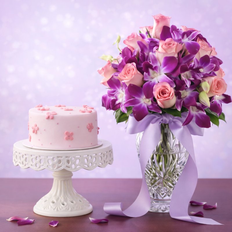 Delicate, graceful, and charming—this beautiful combo features a pastel pink designer cake paired with a luxurious bouquet of fresh orchids and roses arranged in an elegant glass vase. The subtle floral accents on the cake and the rich hues of orchids create a perfect balance of sweetness and sophistication. Ideal for birthdays, anniversaries, romantic surprises, or elegant celebrations.