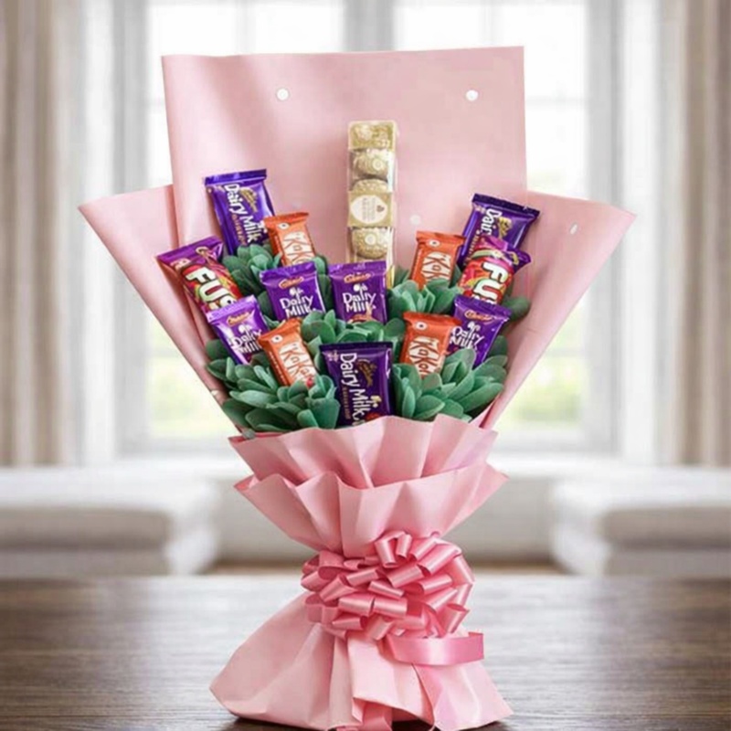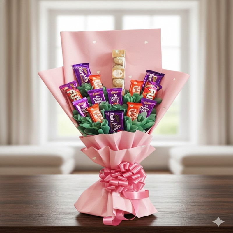 This stunning Premium Choco Blast Bouquet features an irresistible mix of Dairy Milk, KitKat, Perk, Fuse chocolates, and a Ferrero Rocher pack at the center. Wrapped beautifully in pink paper with a designer bow, it’s the perfect gift to celebrate birthdays, anniversaries, surprises, and sweet moments with loved ones.