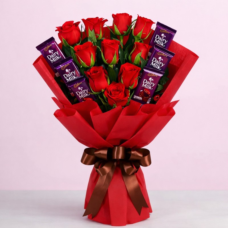 This romantic bouquet features premium fresh red roses beautifully paired with delicious Cadbury Dairy Milk chocolates, wrapped in elegant red paper and finished with a satin ribbon. A perfect blend of flowers and chocolates, ideal for Valentine’s Day, anniversaries, birthdays, or to express love in the sweetest way.