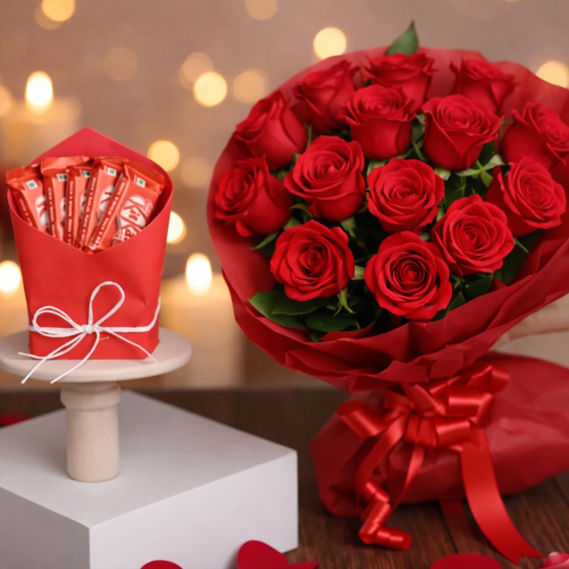 Express your love in the most timeless way with our Red Roses & Chocolate Combo. This elegant arrangement features a hand-tied bouquet of fresh, premium red roses wrapped in luxurious red paper, paired with a beautifully presented chocolate assortment. A perfect blend of romance and sweetness, designed to make every moment unforgettable.