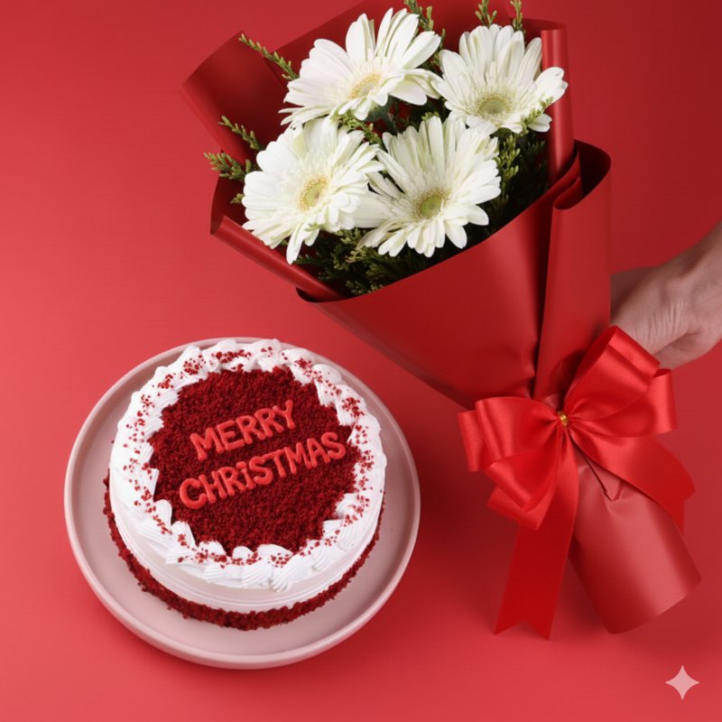 Celebrate the festive season with this graceful Christmas combo featuring a luscious red velvet cake topped with a “Merry Christmas” message, paired with a fresh bouquet of elegant white gerbera flowers wrapped in premium red paper. A perfect gift to share joy, warmth, and festive cheer with your loved ones.