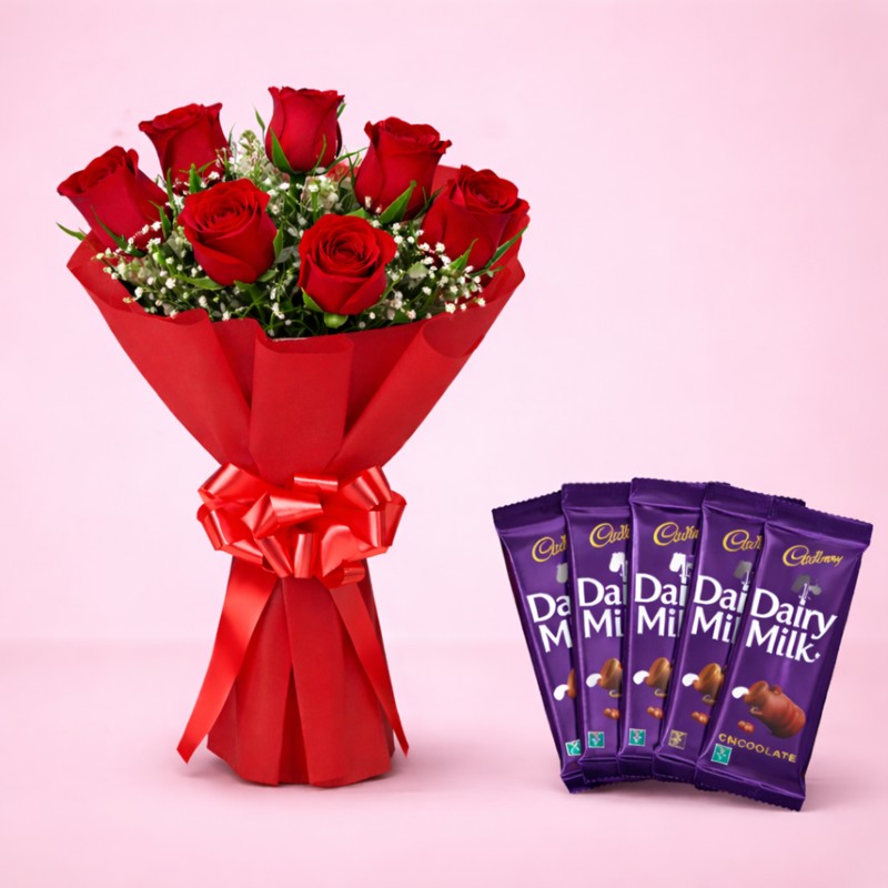 A romantic gift combo featuring fresh red roses beautifully arranged with seasonal fillers and paired with classic Dairy Milk chocolates. Designed to express love, passion, and sweetness, this elegant arrangement is perfect for anniversaries, Valentine’s Day, birthdays, and heartfelt surprises that create lasting memories
