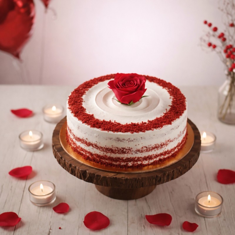 Indulge in this elegant Red Velvet cake layered with soft cream and finished with a romantic swirl of frosting. Topped with a fresh red rose and delicate velvet crumbs, this cake is designed to express love and warmth. A perfect choice for Valentine’s Day and special celebrations.