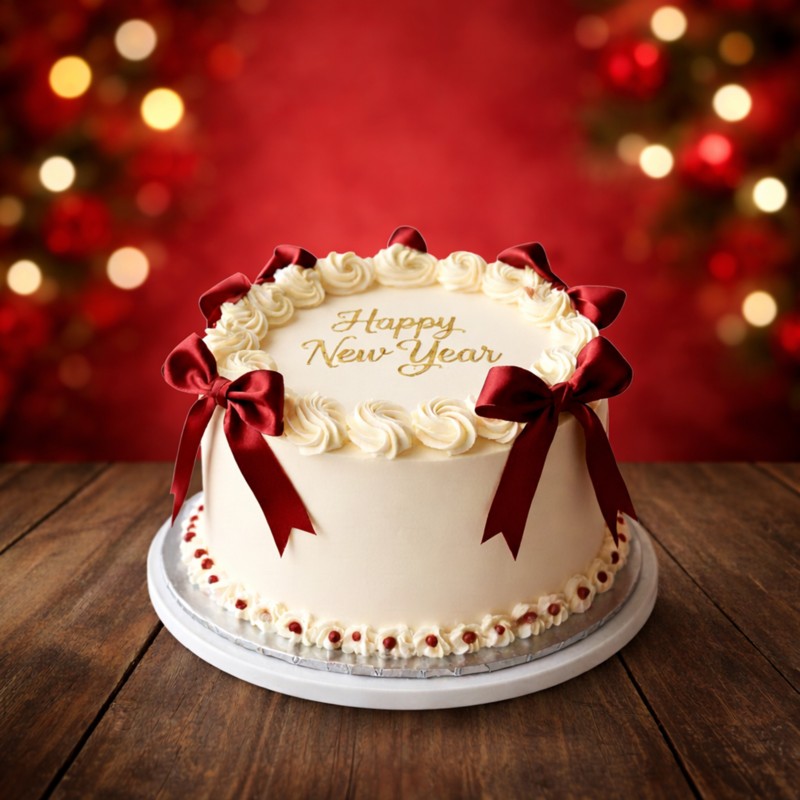 Ring in the New Year with this beautifully crafted cream cake adorned with elegant ribbon detailing and a graceful “Happy New Year” message. Finished with smooth frosting and classic rosette borders, this cake is perfect for intimate celebrations, family gatherings, and stylish New Year parties.