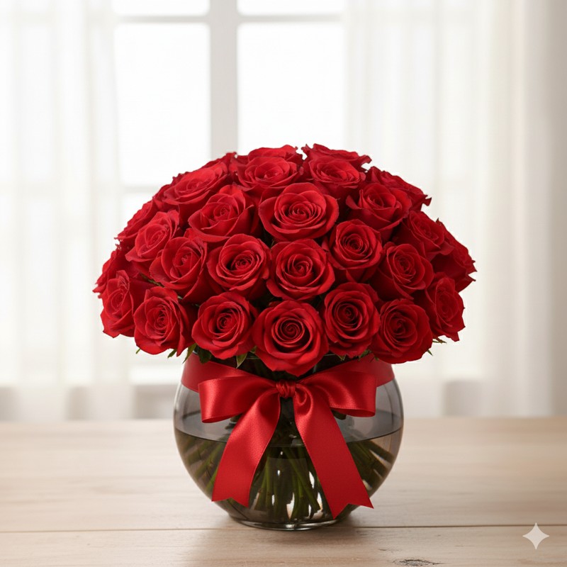A stunning arrangement of 25 fresh red roses beautifully displayed to express deep love and passion. Handpicked blooms are carefully arranged for a rich, romantic look and tied with an elegant ribbon. Perfect for anniversaries, proposals, and heartfelt celebrations to leave a lasting impression.
