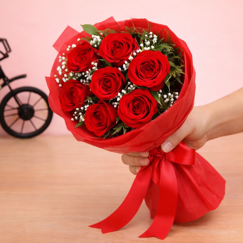 A beautiful bouquet of six fresh red roses, artistically arranged with seasonal fillers and green foliage. Wrapped in elegant red paper, this bouquet is perfect for expressing love and affection. Ideal for birthdays, anniversaries, romantic surprises, and special occasions, adding charm and freshness to every celebration.