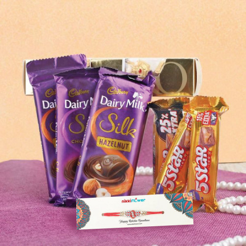 This Product Contains 1 Premium Pearl&Beads Rakhi 4 Pc Ferrero Rochers 3 Silk Chocolate 3 5Star Chocolates