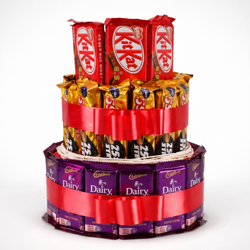 A delightful three-tier chocolate tower crafted with Dairy Milk, 5-Star, and KitKat bars. Perfect for birthdays, surprises, and celebrations, this edible gift brings sweetness in every layer. Wrapped with vibrant ribbons, it’s a fun and unique treat that guarantees smiles and joy for chocolate lovers of all ages.