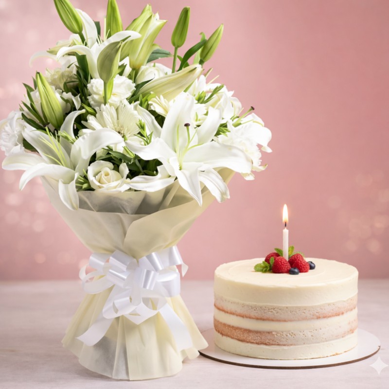 Celebrate purity, elegance, and heartfelt moments with this graceful combo featuring a fresh bouquet of white lilies paired with a soft, creamy celebration cake. The lilies symbolize peace and new beginnings, while the delicately layered cake topped with fresh berries and a candle adds sweetness to every special occasion. Ideal for birthdays, anniversaries, congratulations, and thoughtful surprises.