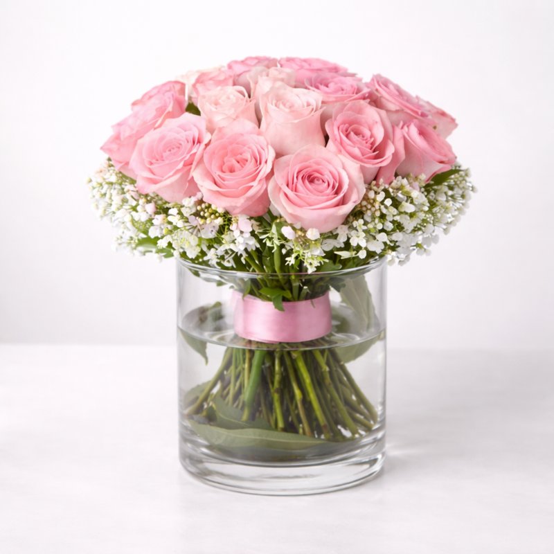 A graceful arrangement of 12 pink roses beautifully set in a clear glass vase. Pink roses symbolize admiration, while white roses represent purity and respect. This elegant floral gift is perfect for celebrating women with warmth, gratitude, and timeless charm on Women’s Day.